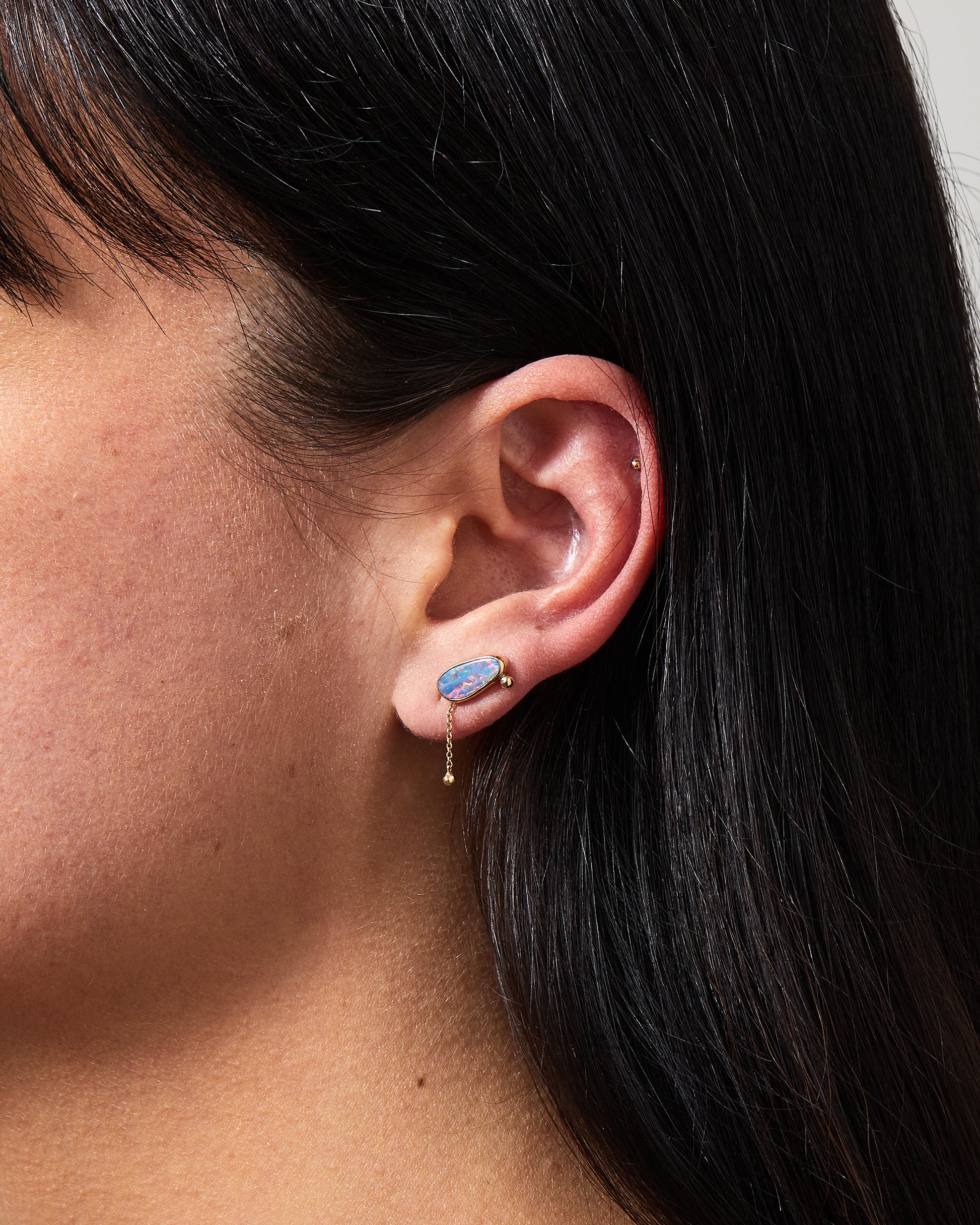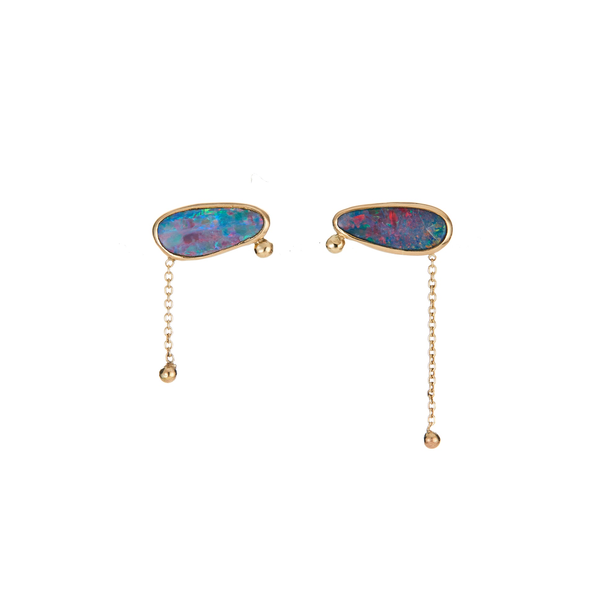 The gold Lagoon Earrings feature luminous opals in 14k bezel settings with delicate chain drop and gold balls. They come with a blackened silver backing and 14k yellow gold ear posts and friction earring backs.