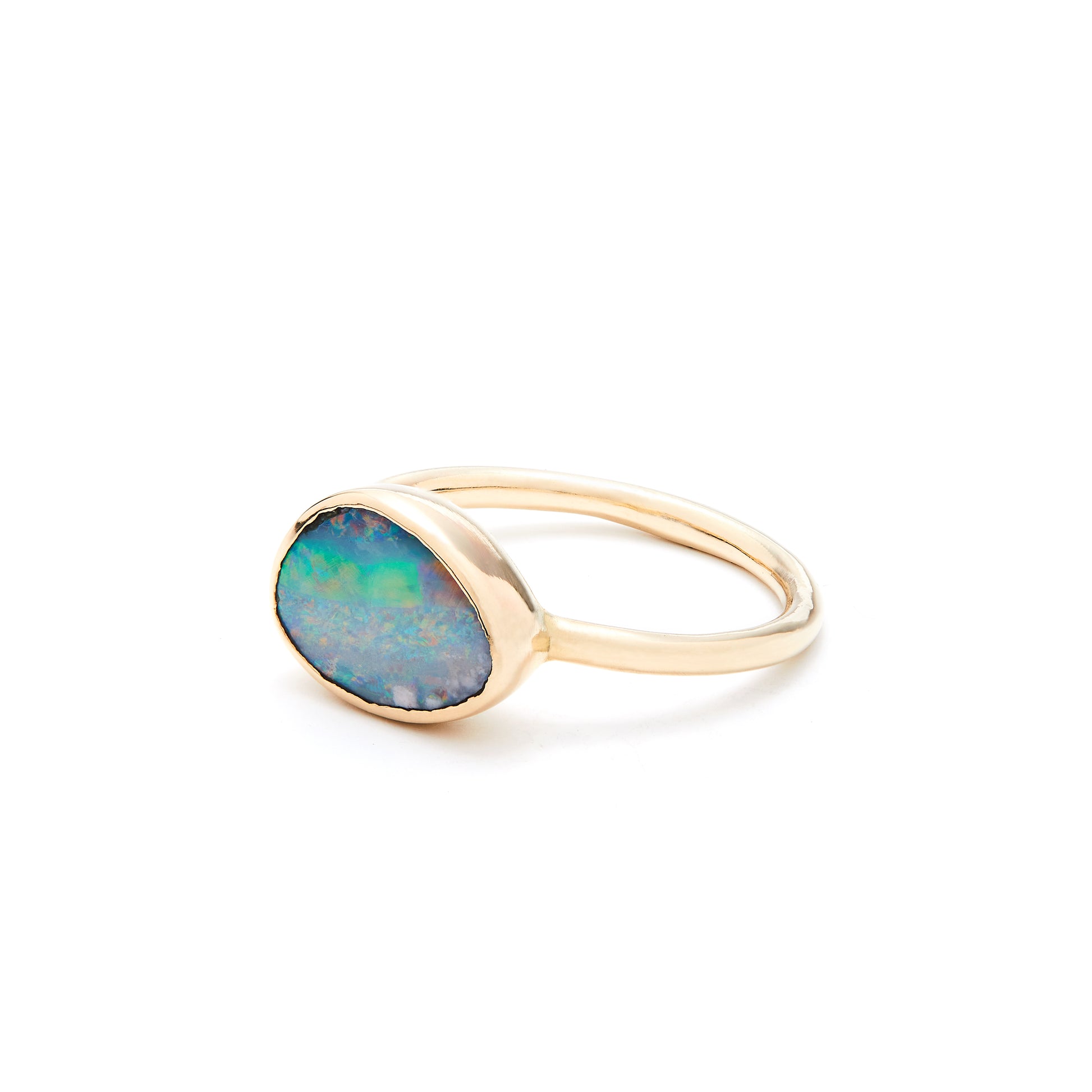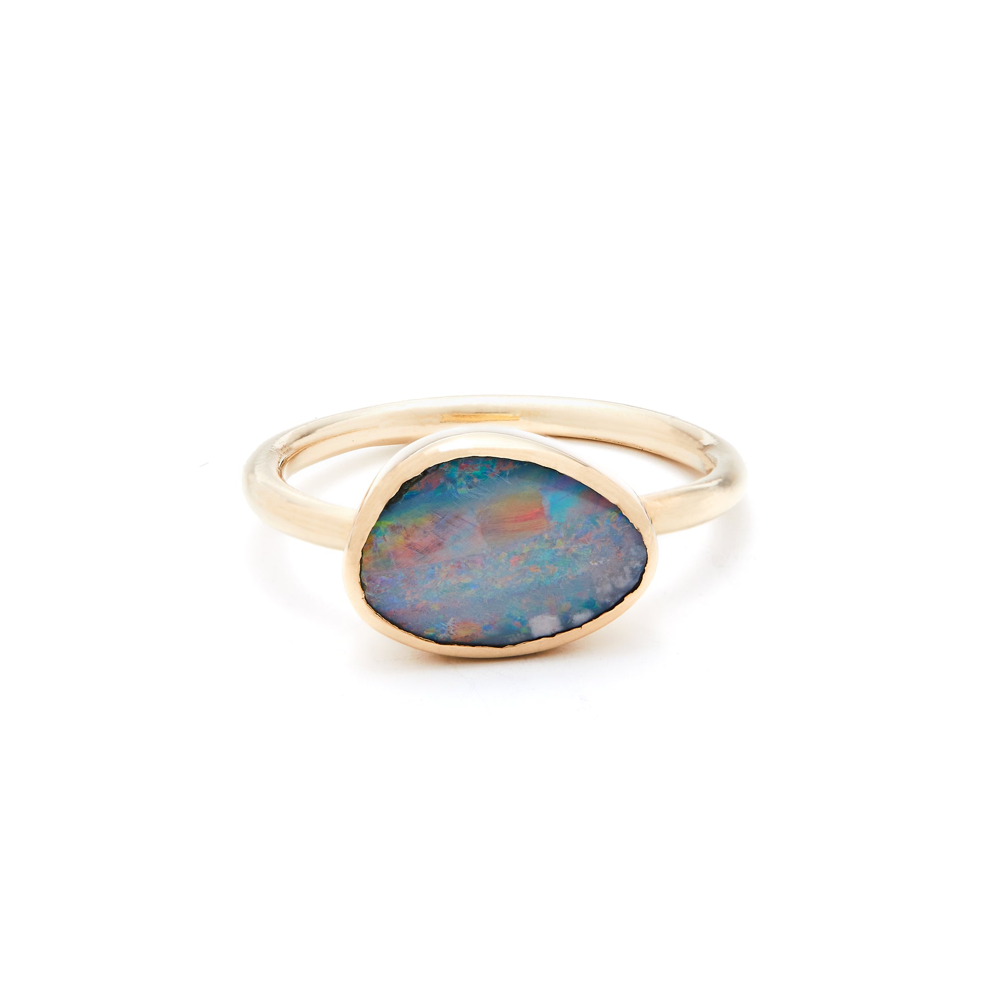 Vibrant boulder opal cupped in 14k yellow gold bezel setting