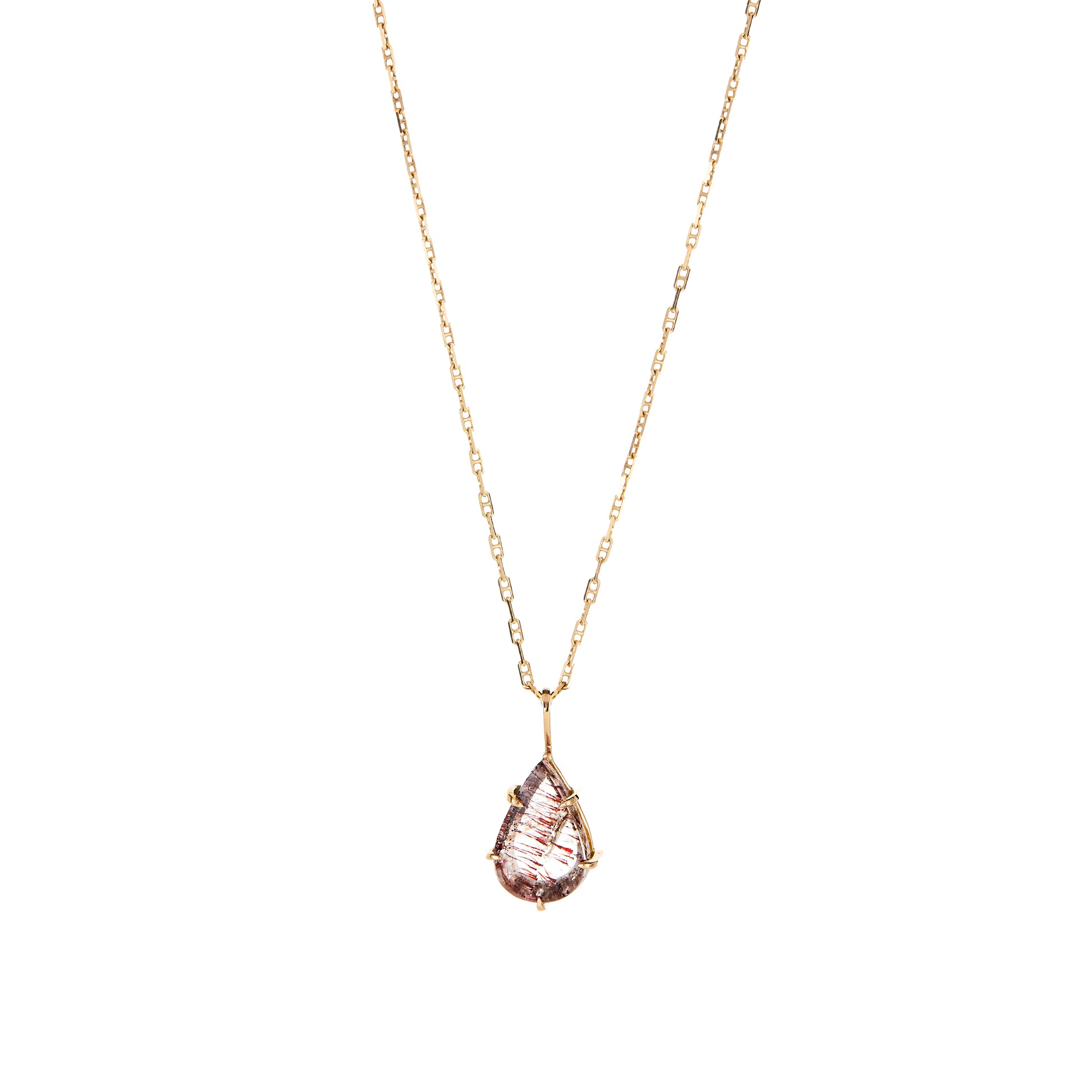 This 14k yellow gold teardrop necklace is set with a rare Super 7 stone, which is a mix of Amethyst, Cacoxenite, Geothite, Lepidocrocite, Rutile and Smoky Quartz, suspended in a clear Quartz Base.