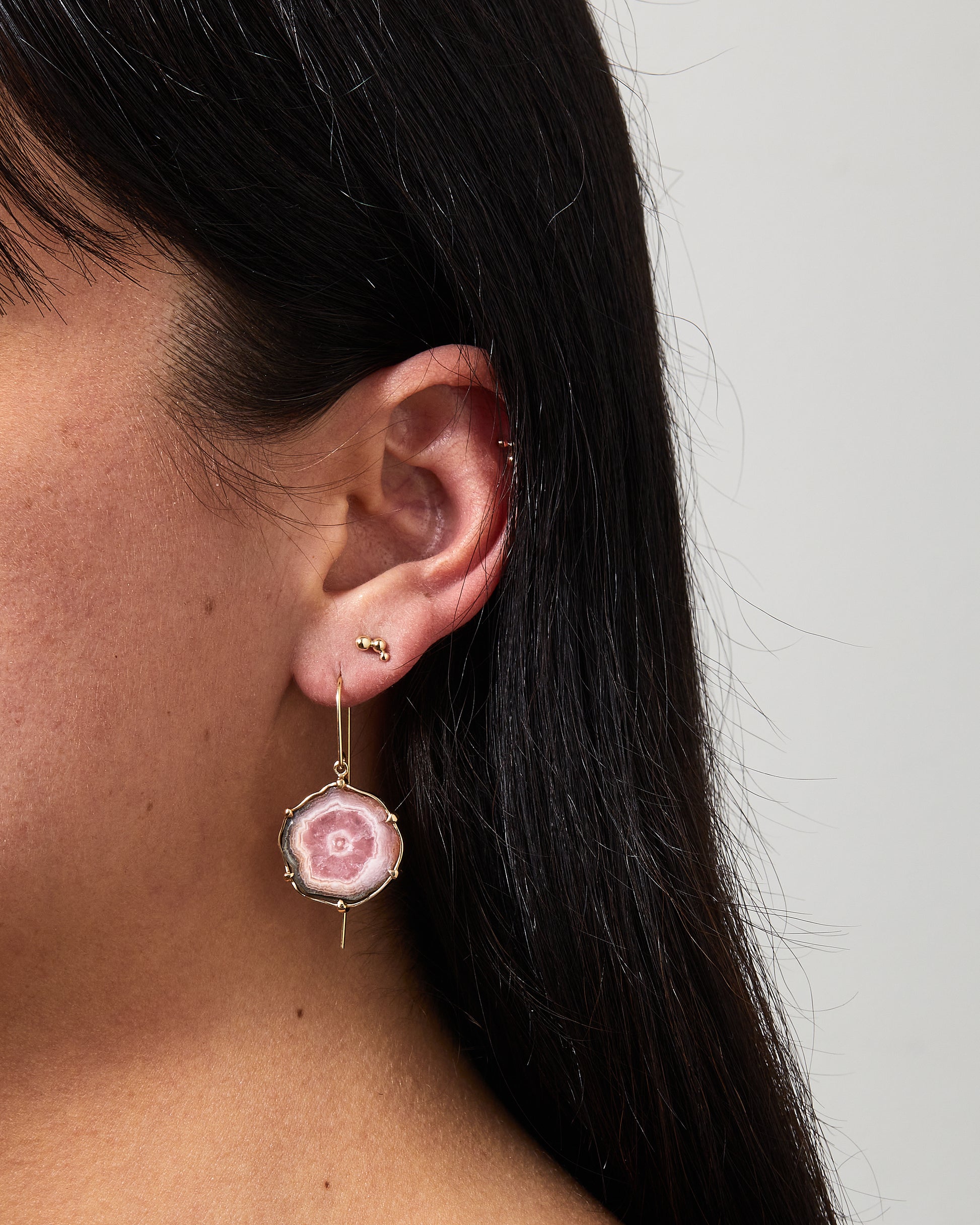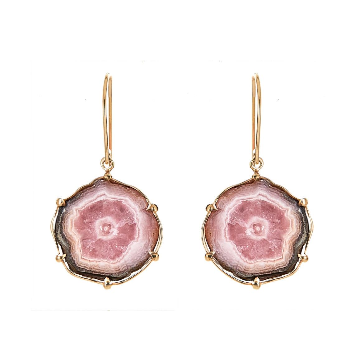 The Whirlpool Earrings feature vibrant slices of Rhodocrosite, set in 14k yellow gold bezels with additional prong settings. They are hung simply and elegantly on ear wires.